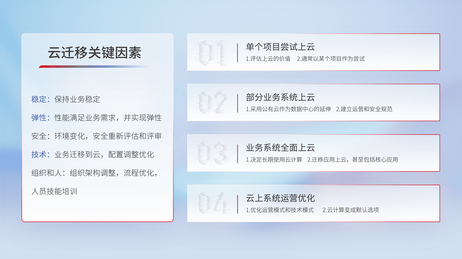 结合实际业务,,,,从规划设计、、、、云平台选型、、、、云原生改造、、数据迁移、、集成交付,,,迁移全过程为客户识别最佳上云路径,,,做好风险识别管理,,,设计网络架构、、、、身份权限、、、、安全审计合规、、、、操作审计、、日志审计、、监控告警策略、、、、多站点容灾设计等,,,,对云上基础设施进行整体规划,,,,提升IT治理水平,,,,以满足弹性、、、高可用、、、高性能的需求。。。。
