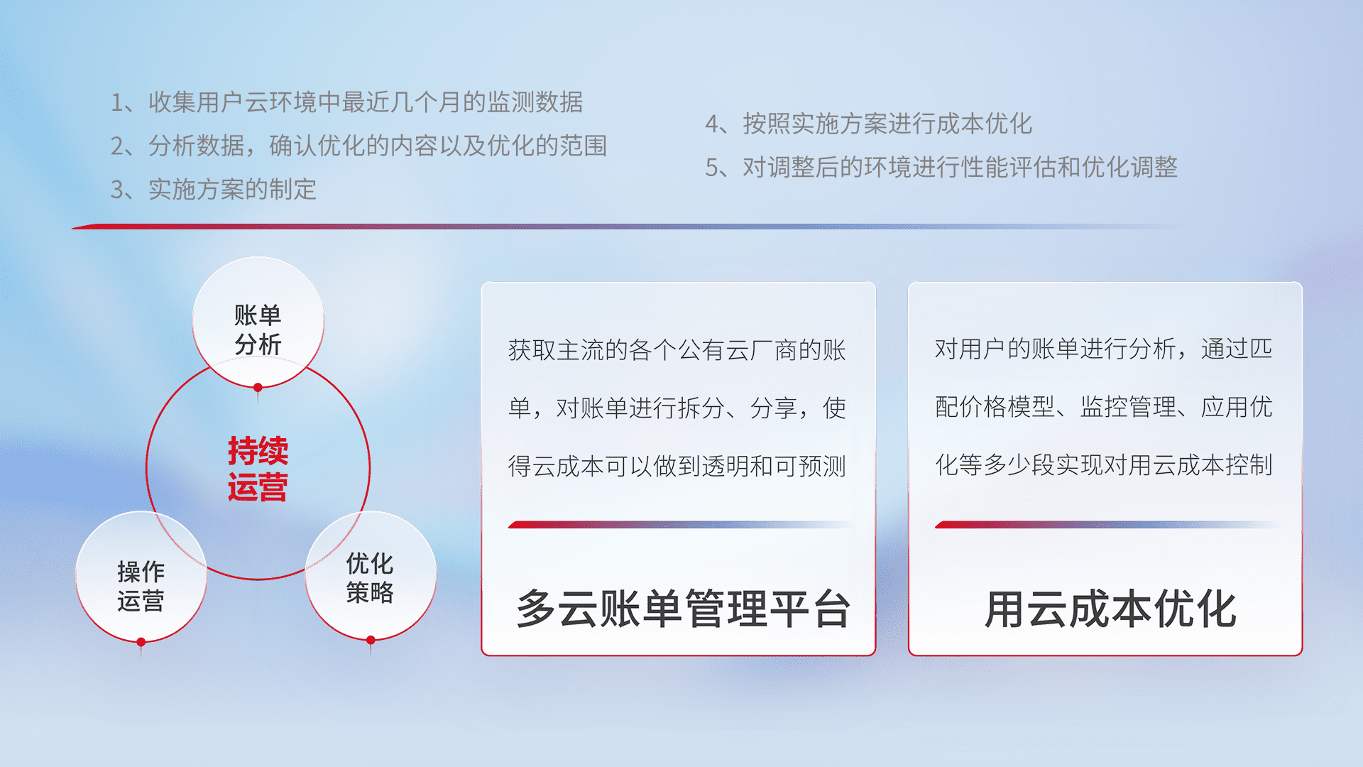 通过多云纳管,,,,以统一的资源数据模型把客户的云资源进行抽象和封装,,,进而实现对多云资源的统一操作,,,保障云资源管理的可靠性、、、、稳定性与可用性。。。。量身定制化运维内容,,配置、、、开发运维、、、补丁管理、、、、备份、、、、监控、、认证和访问管理、、审计和日常巡检等,,,,保障在用云过程中的可靠度,,,,稳定度以及高可用率。。